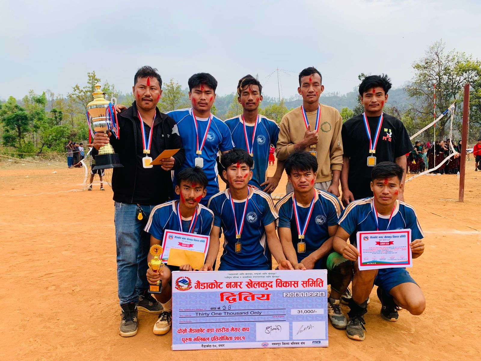 आज भएको फाइनल खेलमा सोहि वडाको समूह “बी”लाई पराजित गर्दै गैँडाकोट ३ “ए” ले उपाधी जित्न सफल भयो । विजयी गैँडाकोट ३”ए” ले ५१ हजार नगद सहित शिल्ड, मेडल र प्रमाणपत्र प्राप्त गर्यो । प्रतियोगिताको उपविजेता ३१ हजार नगद, शिल्ड र प्रमाणपत्र प्राप्त गर्यो । दोस्रो मेयरकप वडा स्तरीय पुरुष भलिवल प्रतियोगितामा गैँडाकोट १८ का समूह “ए” र समूह “बी”ले सान्त्वना स्थान हाँसिल गरेका छन् । सान्त्वना स्थान हाँसिल गरेका दुवै समूहलाई क्रमश १६ हजार नगद सहित शिल्ड, मेडल र प्रमाणपत्र प्रदान गरिएको छ ।