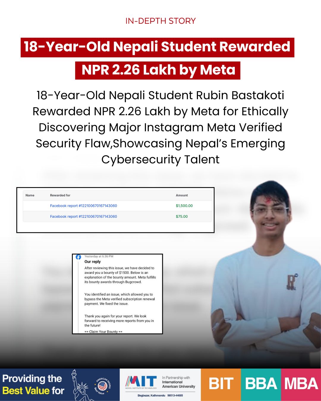 नवलपुर – नवलपुरको गैँडाकोटका १८ वर्षीय विद्यार्थी रुबिन बास्ताकोटीले विश्वप्रसिद्ध सामाजिक सञ्जाल Instagram (Meta) को प्रणालीमा गम्भीर सुरक्षा कमजोरी पत्ता लगाएका छन्। उक्त कमजोरीका कारण Meta Verified सदस्यता प्रयोगकर्ताले मासिक शुल्क नतिरी पनि ब्लु टिक (Verification Badge) सक्रिय राख्न सक्ने अवस्था रहेको पाइएको थियो।