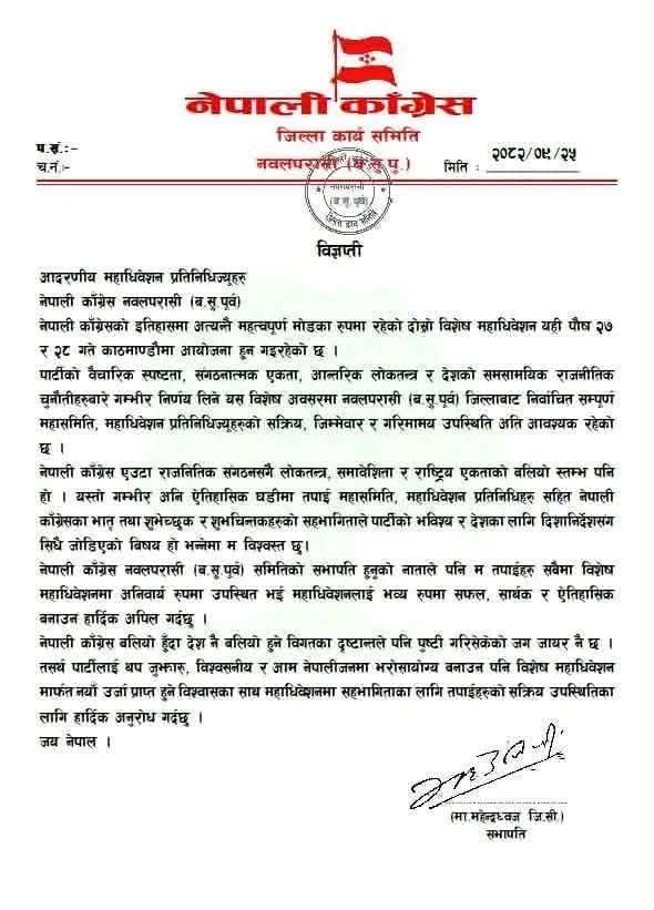 नेपाली कांग्रेस नवलपुरले लोकतन्त्र, संविधान र संघीय लोकतान्त्रिक गणतन्त्रको रक्षा गर्दै पार्टीलाई समयसापेक्ष रूपमा अघि बढाउन केन्द्रीय नेतृत्व गम्भीर हुनुपर्ने उल्लेख गरेको छ। साथै पार्टीका सबै तहका नेता, कार्यकर्ता र शुभेच्छुकलाई विशेष महाधिवेशनको एजेन्डामा एकताबद्ध भई सकारात्मक भूमिका खेल्न आह्वान गरिएको छ।
