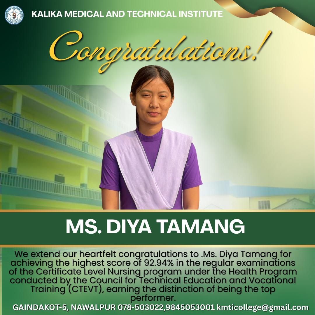 कालिका मेडिकल एन्ड टेक्निकल इन्स्टिट्युट परिवारले दीया तामाङको सफलतालाई संस्थाको गौरवका रूपमा प्रस्तुत गर्दै भविष्यमा पनि निरन्तर उत्कृष्टताको लक्ष्य राख्ने प्रतिबद्धता व्यक्त गरेको छ।