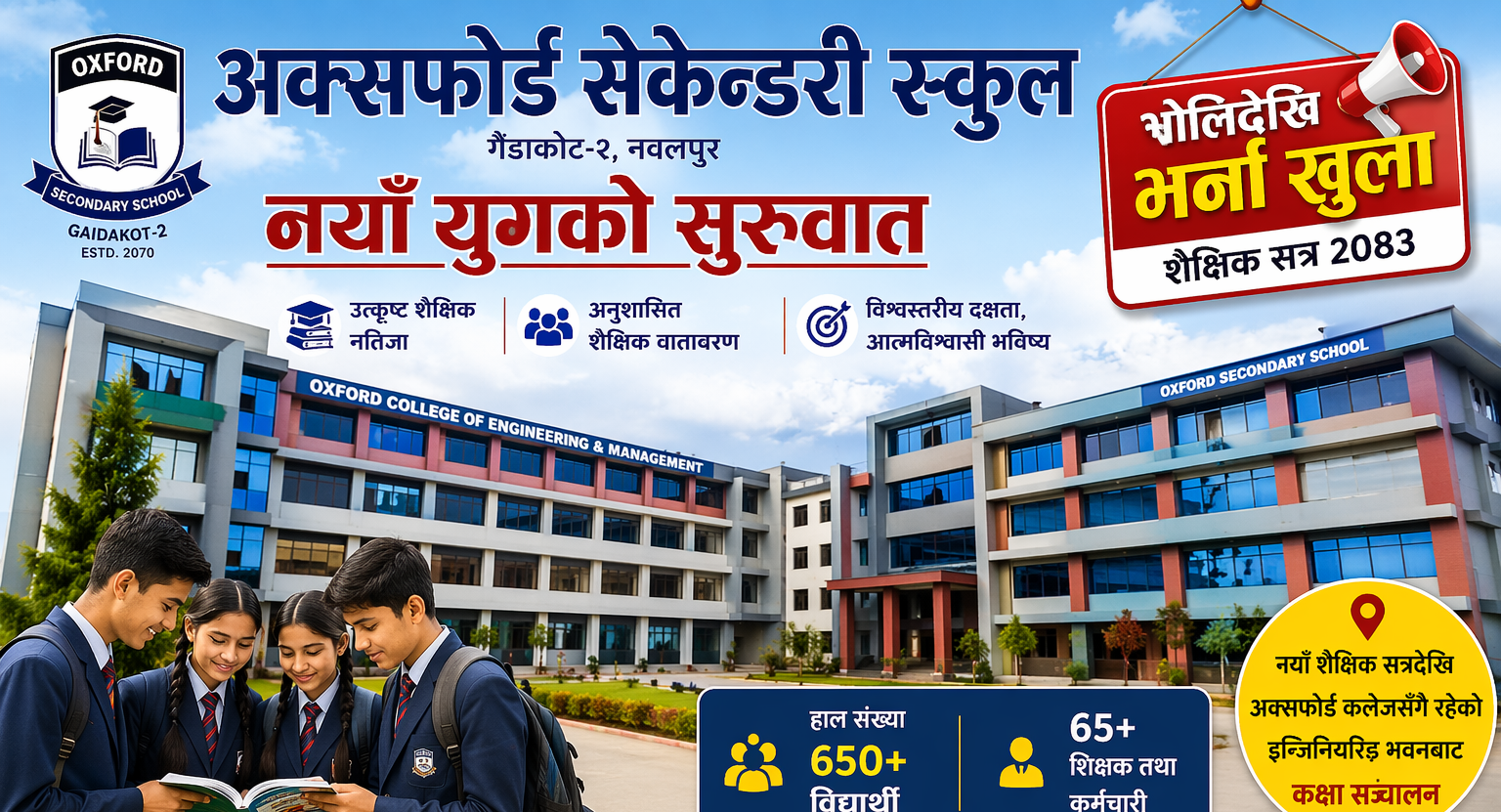 नवलपुर – गैँडाकोट–२ स्थित अक्सफोर्ड सेकेन्डरी स्कुलले नयाँ शैक्षिक सत्र २०८३ का लागि भोलिदेखि भर्ना प्रक्रिया सुरु गर्ने भएको छ। विद्यालयले वैशाख ९ गतेदेखि नियमित कक्षा सञ्चालन गर्ने तयारी गरेको जनाएको छ।